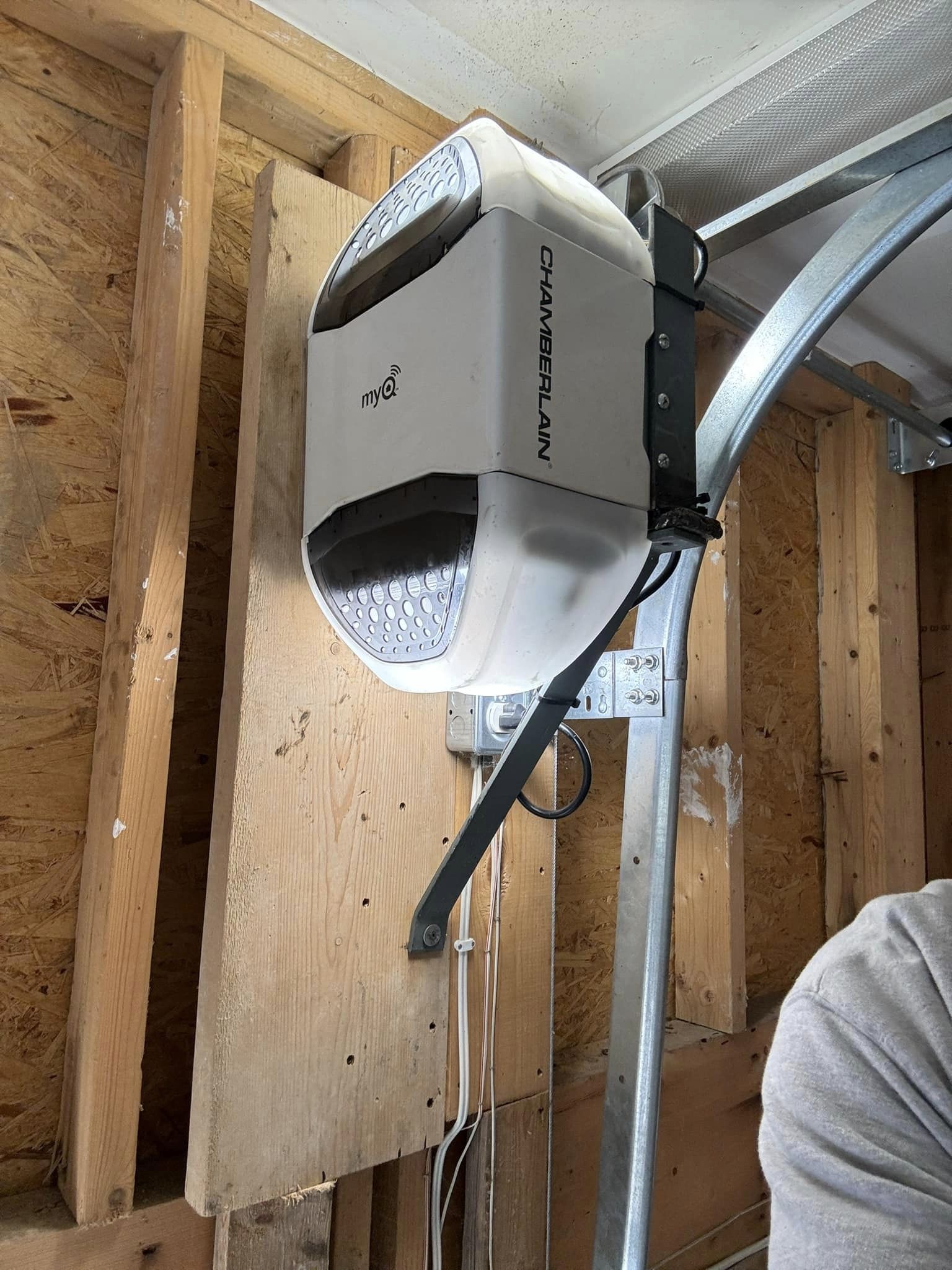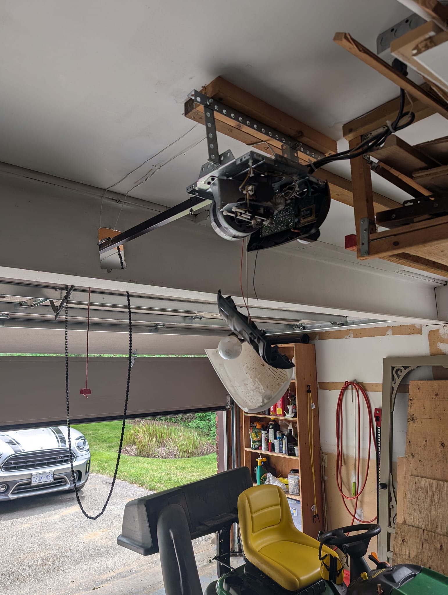 And installing a garage door opener required mounting the mechanism to the ceiling and attaching it to the pulley system supporting the weight of the door. The procedure is fairly difficult, and without the proper equipment, know-how, and experience, it could potentially be dangerous.